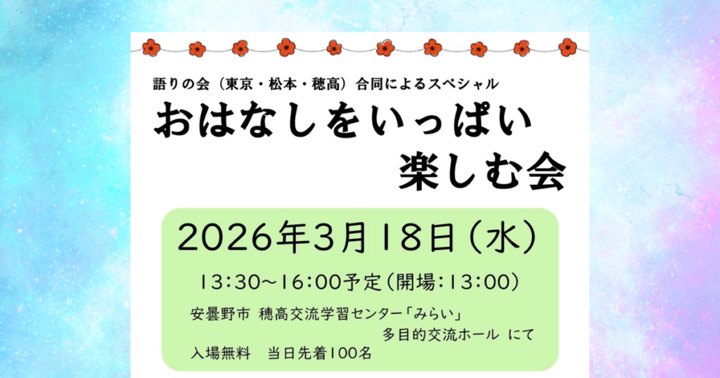 お話をいっぱい楽しむ会~語りの会(東京・松本・穂高)の合同によるスペシャル~ 日時:2026年3月18日(水) 場所:長野県安曇野市穂高交流センター「みらい」内多目的交流ホール -