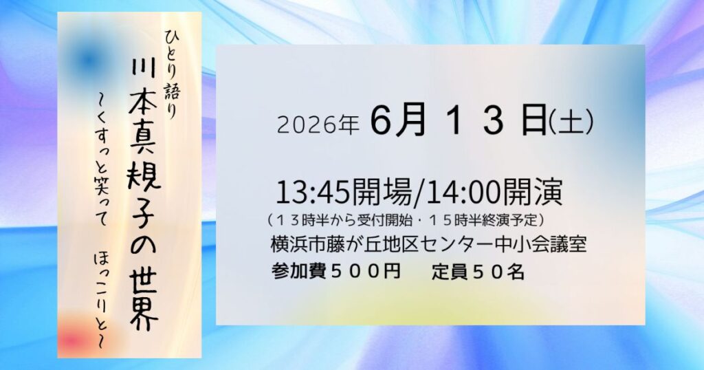 2026年6月3日(水)14:00開演 場所:横浜市たまプラーザ地域ケアプラザ 多目的ホール 無料 要予約 テーマ:青嵐 -