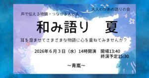 和み語り テーマとプログラム 2014年4月~2015年2月 2024 10/30 和み語り 2015年3月1日2024年10月30日 2014年4月~2015年2月まで 声で伝える物語・つながる人と人 大人のための語りの会 耳をすませてさまざまな物語に心を重ねてみません? 最近のコメントZoom&会場 弥生語り に 語り普及スタッフ よりZoom&会場 弥生語り に ほら話大好き よりZoom&会場 弥生語り に ひろりん より 和み語り 関連記事 和み語り夏 2026年3月31日 和み語り 春 2026年1月15日 和み語り 冬 2025年10月27日 和み語り 秋 ~星月夜~ 2025年7月20日 和み語り 夏 2025年6月4日 2025年4月28日 和み語り 春 光さす 2025年2月1日 和み語り 冬 ~終わりよければ~ 2024年10月28日 和み語り テーマとプログラム集 2023.12~2024.9 2024年10月9日 コメント コメントする コメントをキャンセルコメント ※ 名前 メール サイト Δ