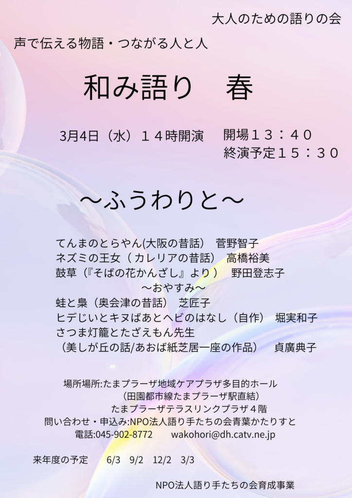 昔話、伝説、古典、創作・・・さまざまなお話に耳を傾けてみませんか。