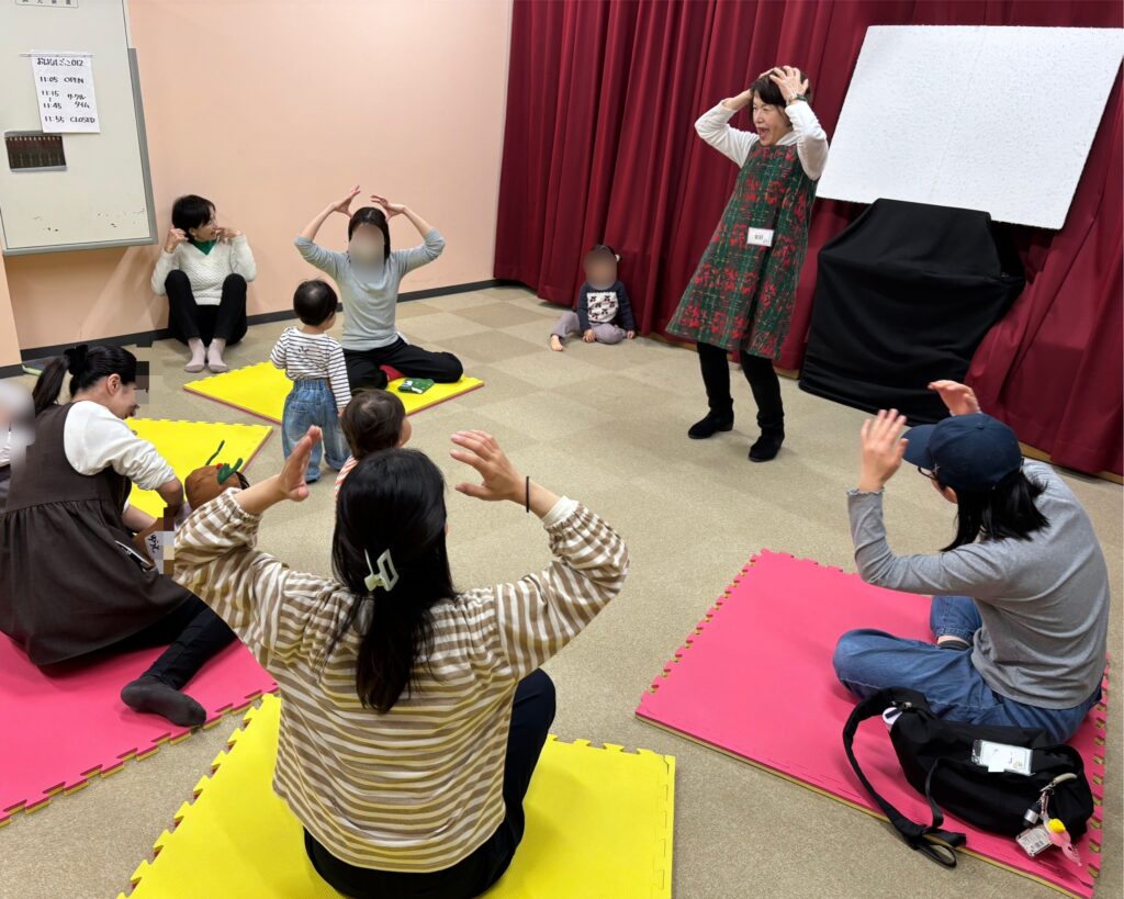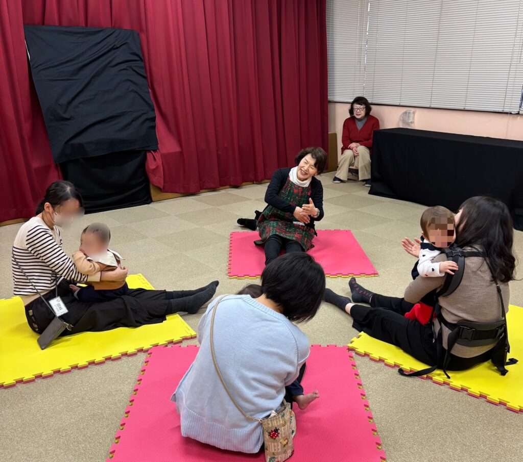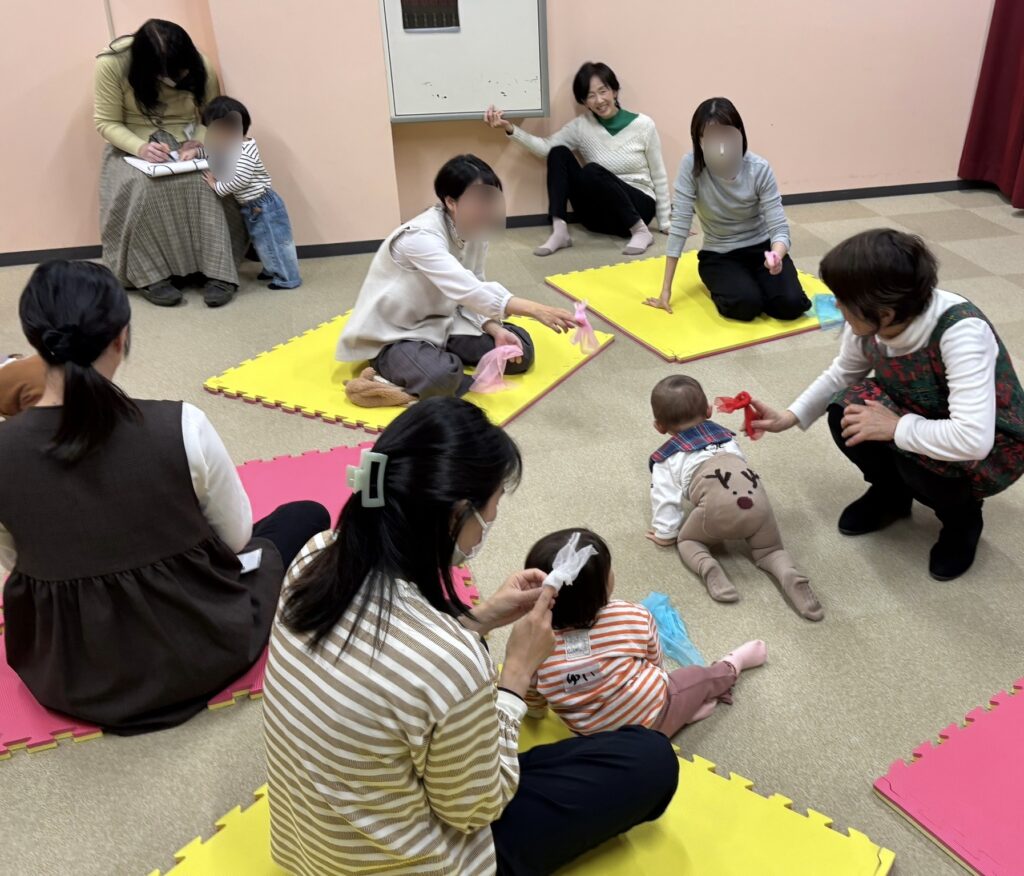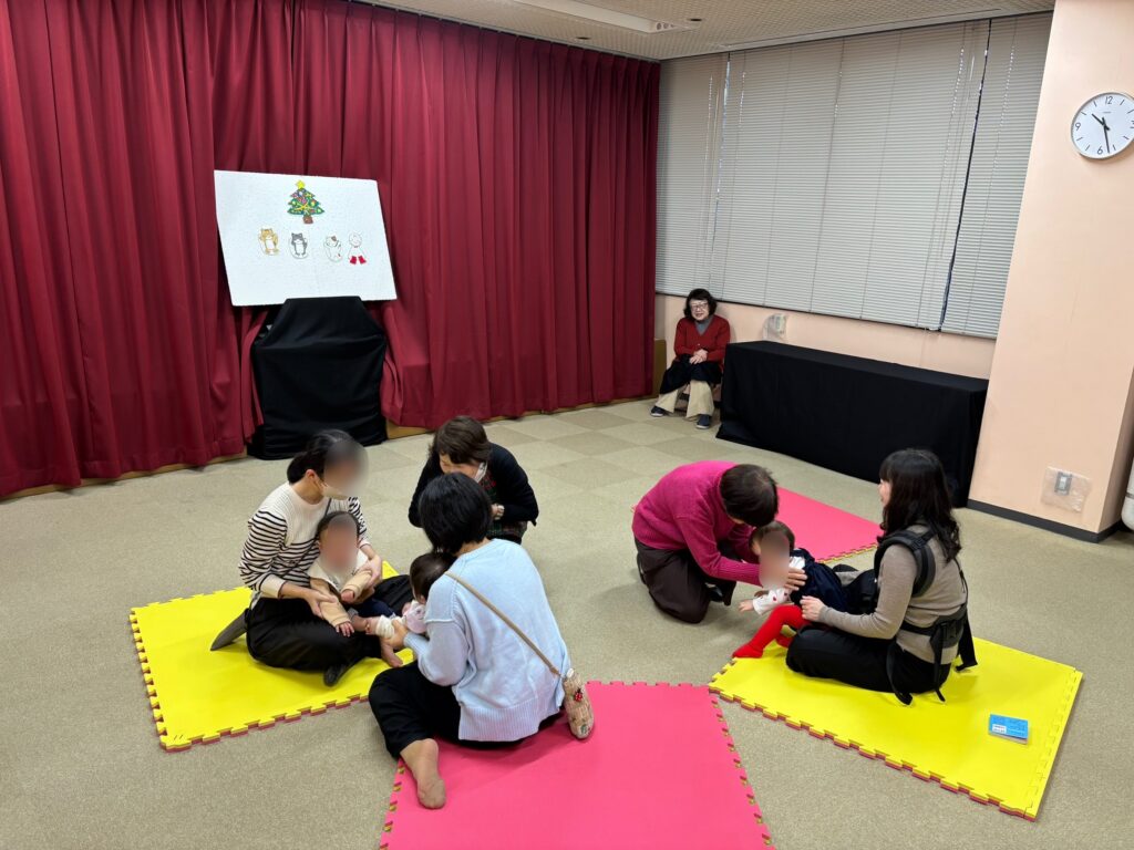 ママのお膝で仲良し、ぎゅうっとしたり、お友達とあいさつ遊びを楽しみました。