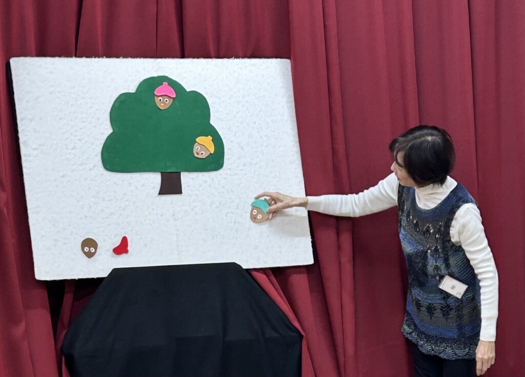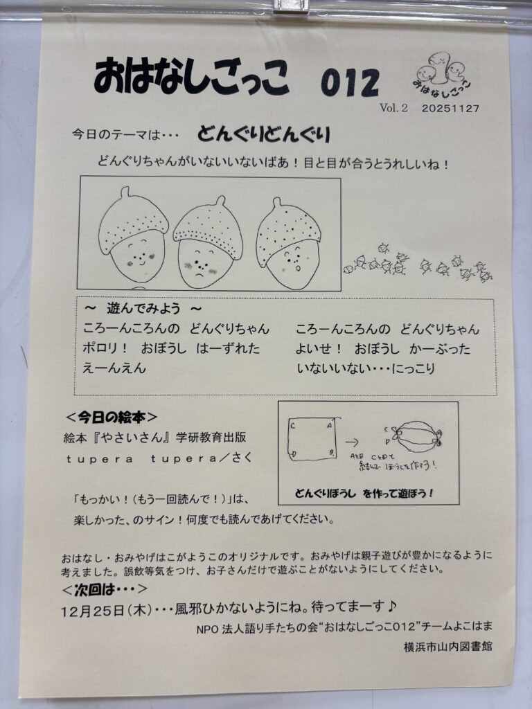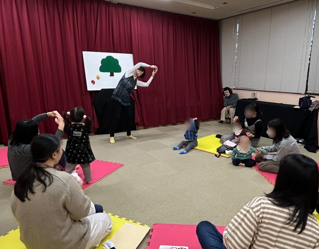 どんぐりのパネルシアターを見て、どんぐりちゃんになってころん、ころん。ママのお膝で揺れたり、自分で揺れたり、楽しいね!