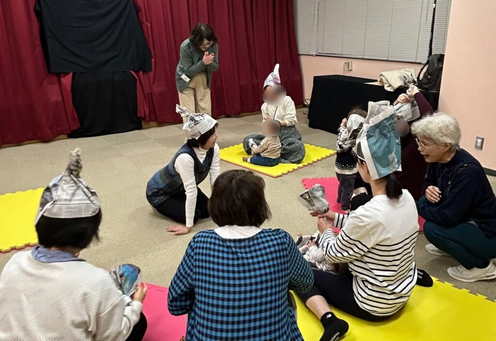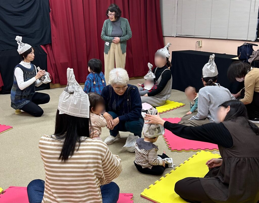 新聞紙でどんぐりちゃんの帽子を作り、みんなで身体あそびをしました。