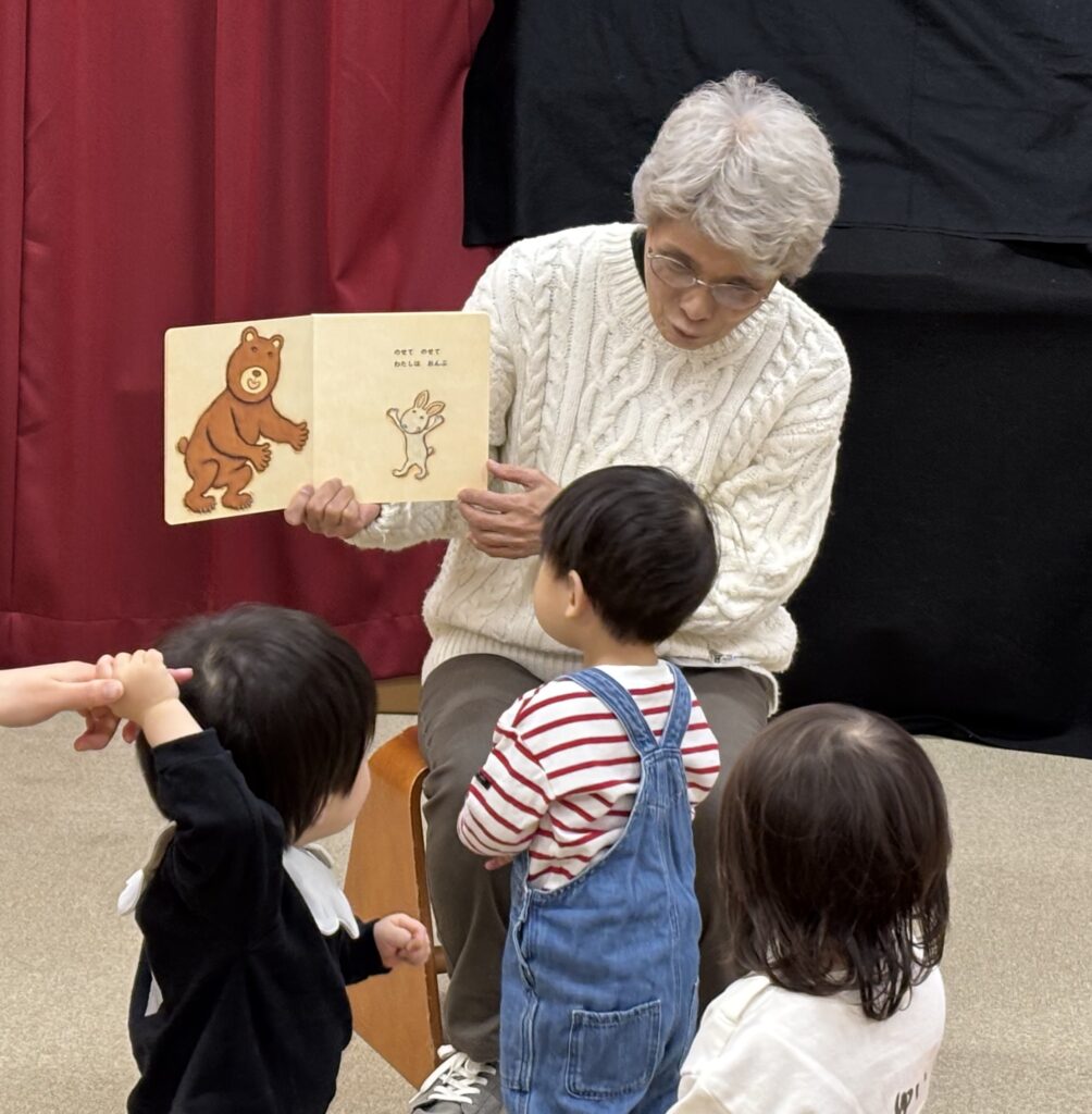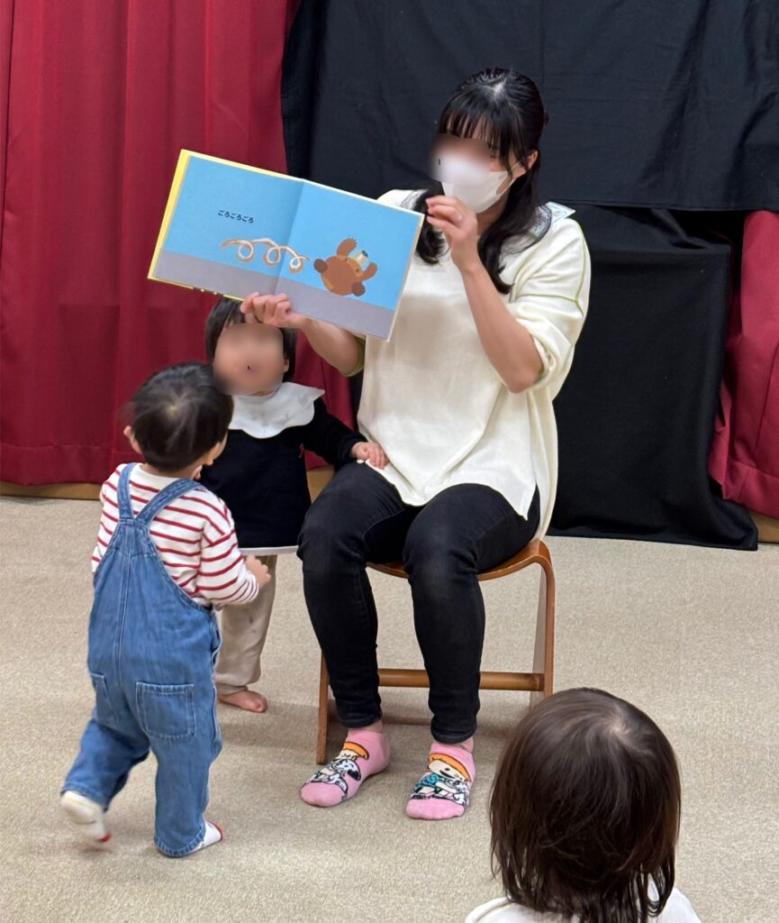 もう一冊は「はくしゅ ぱちぱち」いろんな動物がでてきてはくしゅ~!なになに?とみんな絵本に見入っています。