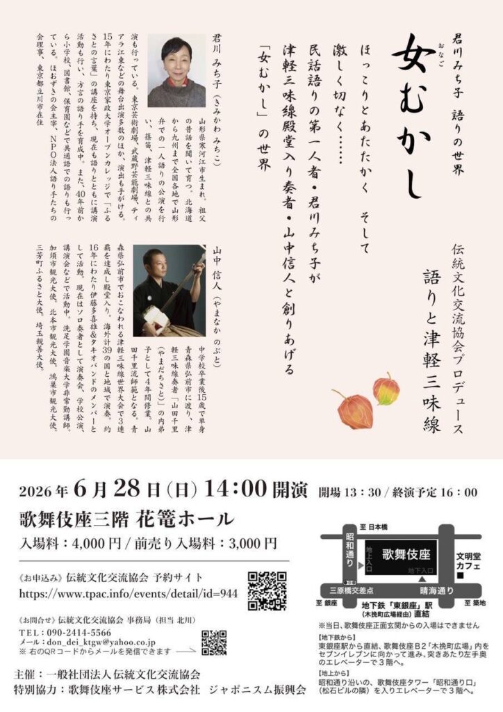 君川みち子が津軽三味線殿堂入り奏者・山中信人と創りあげる「女むかし」の世界