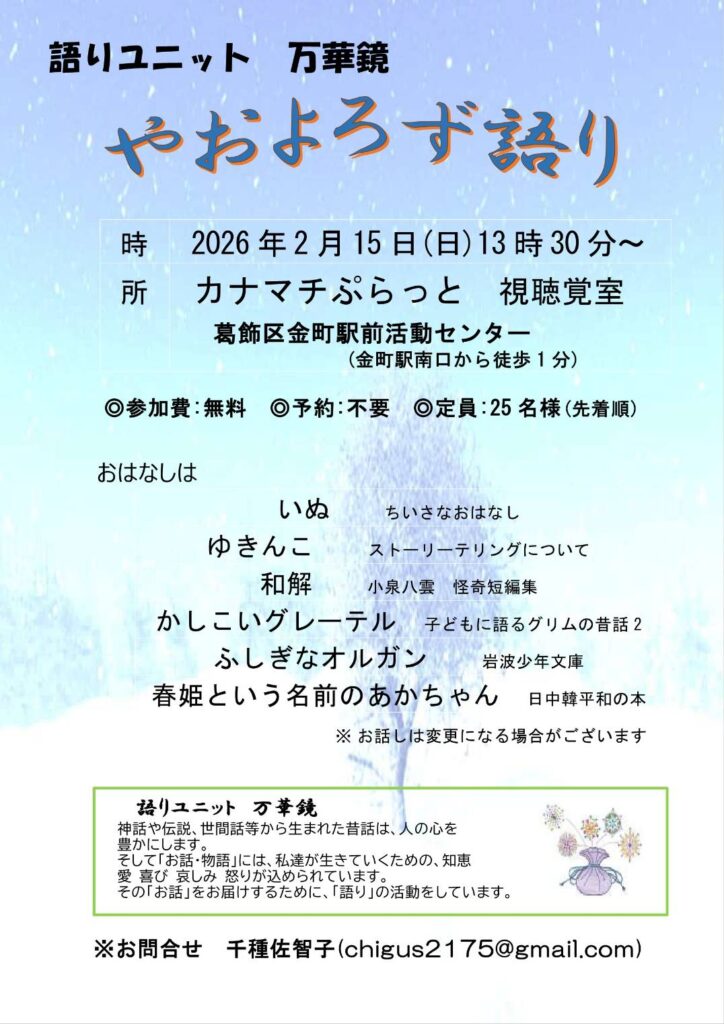 やおよろず語り 2026 1/07 Pic up2 全国語り情報 2026年1月7日 やおよろず語り 日時 : 2026年2月15日(日)13:30〜 会場 : カナマチぷらっと (JR金町駅・京成金町駅より徒歩1分) 入場無料/申込不要(先着25名) 語りユニット万華鏡(天井靖子/甲斐 行子/小柴 美香子/齊藤 真知子/千種 佐智子) 最近のコメントテラブレーション in TOKYO 2025 に 普及スタッフ よりテラブレーション in TOKYO 2025 に どんぐり よりテラブレーション in TOKYO 2025 に ころりん より Pic up2 全国語り情報 関連記事 ニリンソウ 二人語り vol 5 2025年12月3日 遊ぶ声たち:語りの会 2025年11月23日 おはなし夢夢 専科生の秋語り 2025年11月6日 朗読お話会 土筆の会 2025年10月10日 やおよろず語り 2025年10月9日 よもやま話を楽しむ Vol.8 虹蔵不見 2025年10月6日 おつまみ語り 2025年9月26日 ニリンソウ 二人語り vol.4 2025年9月25日 コメント コメントする コメントをキャンセルコメント ※ 名前 メール サイト Δ
